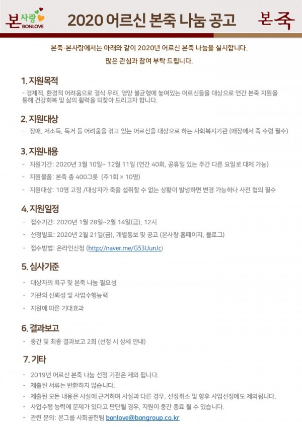 [본사랑] 2020 어르신 본죽 나눔 공고