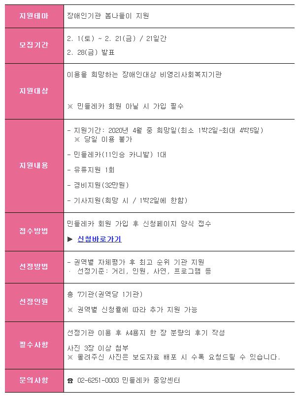 한국도시가스협회 대표사회공헌사업도시가스 민들레카는 장애인기관을 대상으로 4월 경비지원여행 모집을 진행합니다.회원님들의 많은 관심과 신청 부탁드립니다.