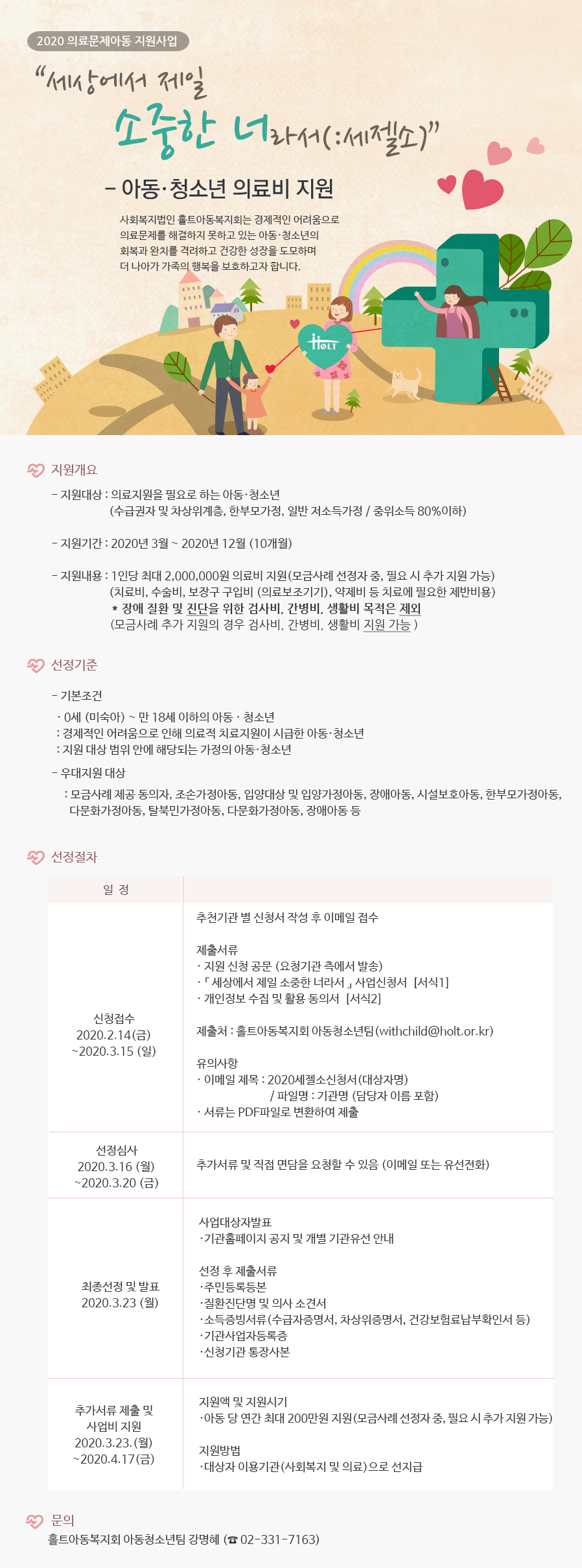 [홀트아동복지회] 2020 의료문제아동 지원사업 ‘세상에서 제일 소중한 너라서’ 지원대상자 모집